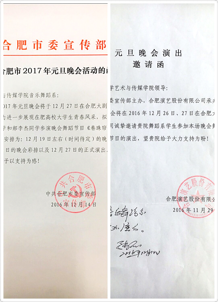 受合肥市委宣传部、合肥演艺股份有限公司的邀请并按照学院领导的相关指示,音乐舞蹈系组织了18人的舞蹈表演专业师生团队参与了本场晚会歌舞《节日欢歌》、舞蹈《卷珠帘》和舞蹈《水欢鱼跃》三个节目的排演工作。其中,《水欢鱼跃》是全国舞蹈比赛“荷花杯”的银奖作品。同学们和合肥市歌舞团的演员们用优美的舞姿共同演绎了700万合肥市民共享繁荣、其乐融融的和谐社会大家园的幸福场景,赢得了连连掌声,获得了高度评价。