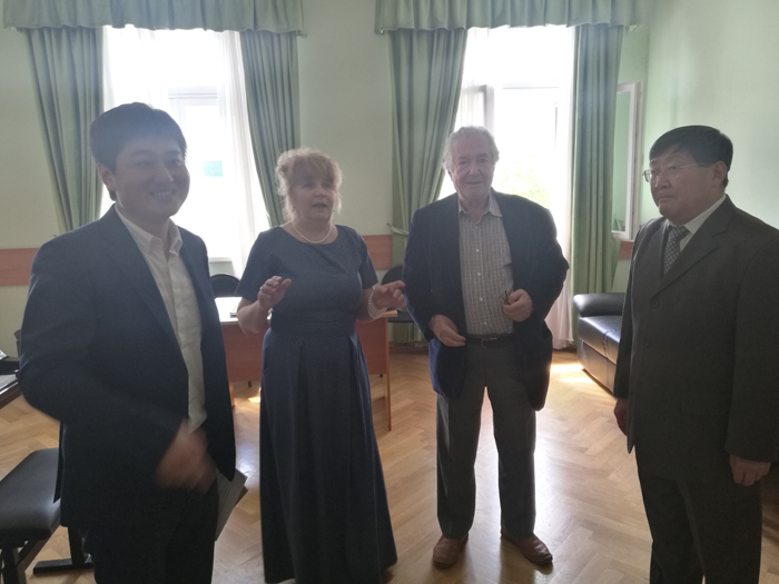 在莫斯科国立柴可夫斯基音乐学院(简称柴院),访问团一行受到该校校长索科洛夫、分管外事副校长苏罕洛夫、分管教学副校长斯鲁茨卡娅的热情接待。周之虎向其介绍了学院的基本情况,以及出访柴院的目的,希望重点在艺术交流、教师互访、学生培养、艺术教育培训等方面开展交流合作,在达成共识的交流合作项目上签订协议。经过洽谈,初步达成如下合作意向:1.在安徽大学艺术与传媒学院举办柴可夫斯基音乐学院夏季学院,由柴院派教师执教,发柴院结业证书;2.学院派青年教师到柴院进修、访学、读博。首先邀请我院青年教师参加柴院今夏夏季学院学习,或派艺术指导教师去进修;3.进行两校师生艺术交流,特别是到俄罗斯进行安徽黄梅戏和地方民乐交流;4.柴院轮流派教师到我院作为外籍教师执教;5.在我院举办柴院钢琴或声乐大师班;6.由我方草拟合作协议,待双方认可后,再择机签署。