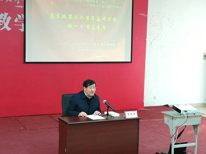 11月24日下午,学院党校在第三阶梯教室举行第四期入党积极分子培训暨开学典礼。学院党委书记、院长、党校校长周之虎教授出席开学典礼并主讲第一堂党课《为实现第二个百年奋斗目标,做一个有志青年》。开学典礼由组织人事处处长曹晓富主持。