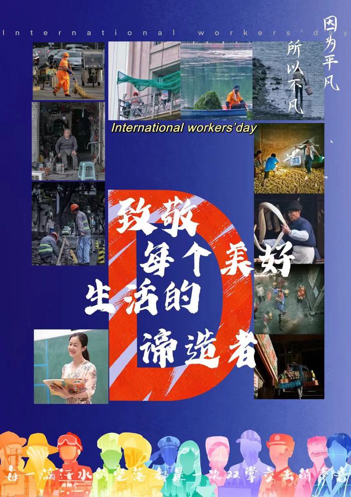 海报介绍:用每个不同劳动者的照片拼出来的五一,更能突出劳动这个主题,中间组成五的那个D,没有全涂成红色,寓意不完美所以平凡,与右上角的因为平凡,所以不凡相呼应,我认为劳动者是每一个美好生活的缔造者,我把这句话放在了海报的最中间,突出劳动的主体。背景是纹理渐变蓝,蓝色包容万物。画面的最底端是我拼贴的各个职业的素材,每个素材里边,都有关于他们的职业影像,简洁明了。