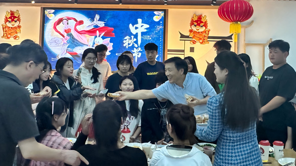 午餐会现场,陈林和师生们一起分享中秋节月饼。师生互动交流,共话家乡中秋习俗、故事。同学们纷纷表示,虽然没能回家过节,但依然感受到了浓厚的节日氛围和新利体育法甲这个大家庭的温馨体贴。