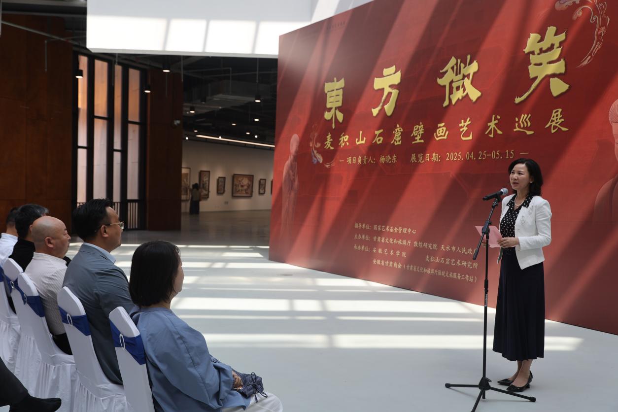 国家艺术基金2024年度传播交流推广项目“东方微笑——麦积山石窟壁画艺术巡展”近日在我校美术馆开幕。校党委委员、组织部长王出席开幕式并致辞,安徽省美术家协会、安徽省图书馆、安徽大学艺术学院、合肥师范学院美术与设计学院、安徽艺术职业学院等单位的领导、专家和我校师生300余人出席了开幕式。开幕式由美术学院院长束新水教授主持。