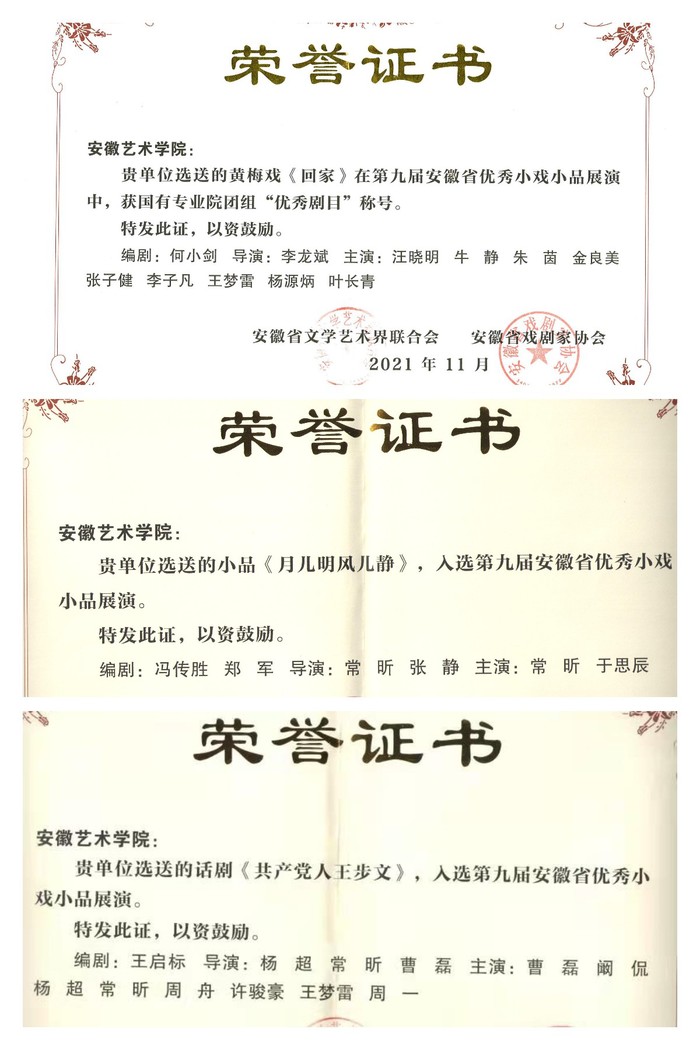 近日,由安徽省文联和安徽省戏剧家协会联合主办的第九届安徽省优秀小戏小品展演推优结果传来喜讯,我校黄梅小戏《回家》获国有专业院团组优秀奖,小品《月儿明风儿静》和短剧《共产党人王步文》同获入选奖。