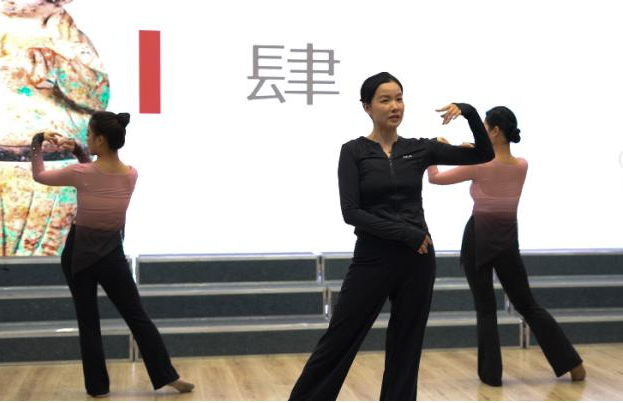 讲座现场,张楠通过讲解唐代历史与唐代女性的生活习俗引出舞蹈《唐印》的表现形式,剖析舞蹈的基本动作,同时分析其背后的文化内涵。老年学员们分组学习,教师与学生助教进行一对一的指导教学,现场学习气氛热烈,学员们学习的积极性高涨。