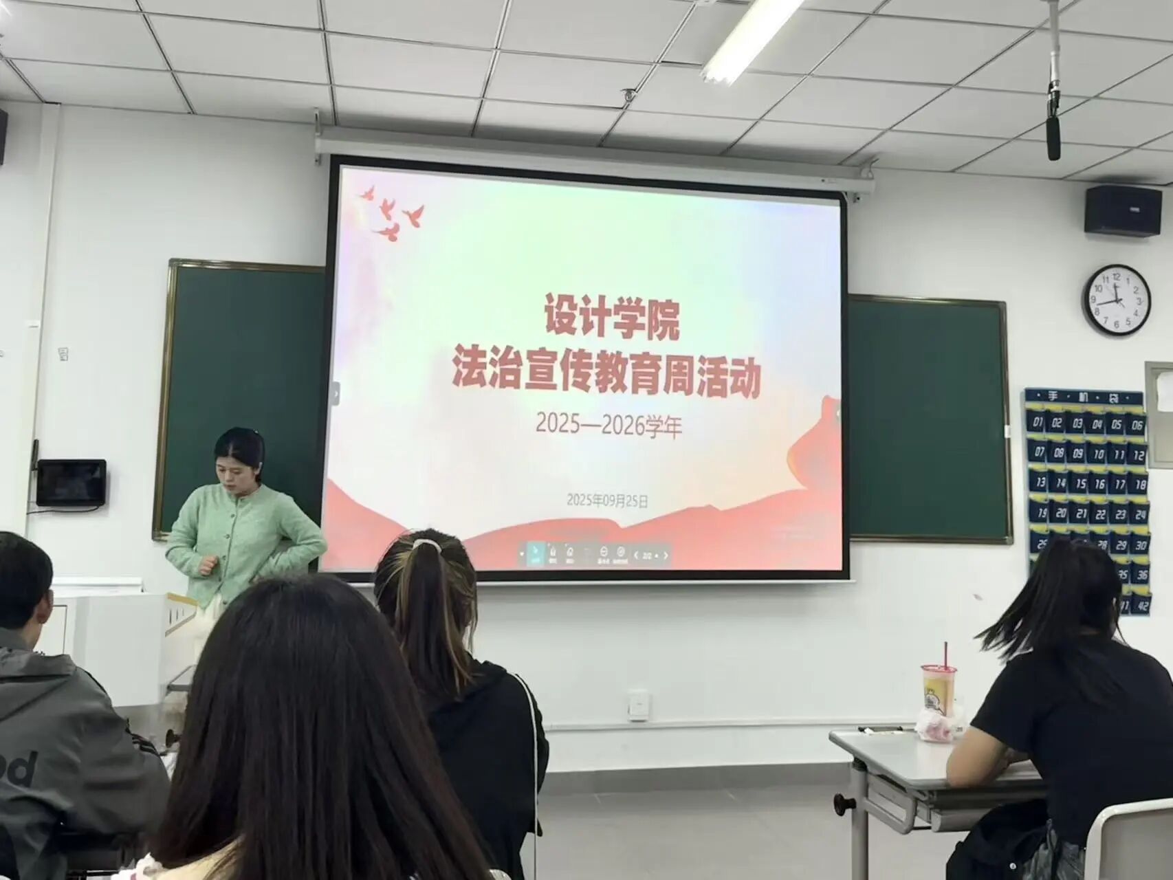 为增强学生法治观念,提升法律意识与自我保护能力,9月25日,设计学院以“法治护航青春,设计筑梦未来”为主题在设计楼304教室开展主题团课活动。活动由学院团总支挂职副书记薛莲老师主持,全体学生代表共同参与,通过理论讲解、影视教育、互动问答等形式,让法治知识融入校园生活,为学生成长筑牢法治防线。