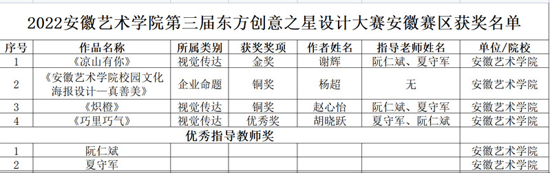 热烈祝贺我院在第三届东方创意之星设计大赛安徽赛区获金奖1项,铜奖2项,优秀奖1项,优秀指导教师2项。东方创意之星设计大赛是进驻教育部《高校学生竞赛与教师发展数据平台》,成为申请扩容的竞赛项目。大赛分设自由命题类和企业命题类,大赛产生的优秀作品将通过相关联的合作机构转化为正式发行的实用性或商业化产品,进入社会与市场。