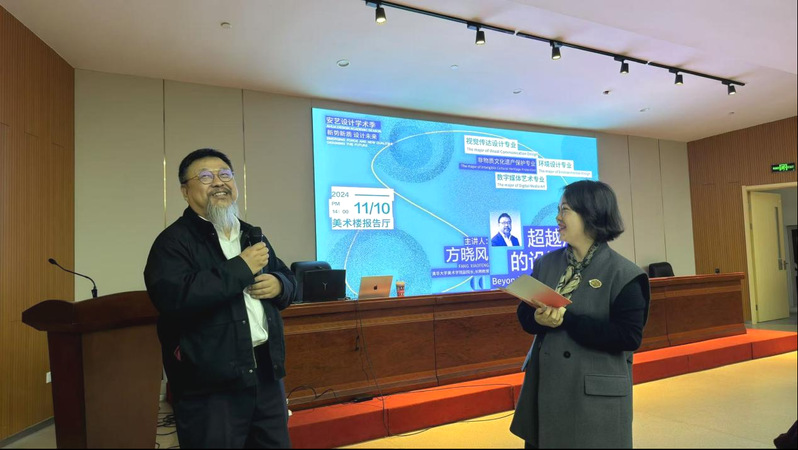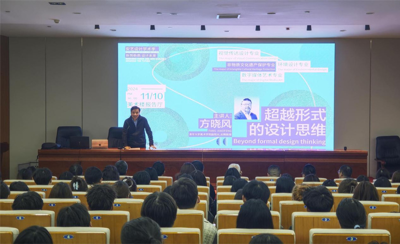 11月10日,一场主题为《超越形式的设计思维》的讲座在新利体育首页官网美术楼报告厅成功举办。本次讲座是“新利体育法甲设计学术季”系列讲座之一,由清华大学美术学院副院长,长聘教授博士生导师,中国《装饰》杂志社主编、编委方晓风教授主讲,新利体育首页官网党委委员、副校长陈林主持,设计学院党总支书记俞璋凌作总结讲话。设计学院众多学子与相关教师前来聆听。